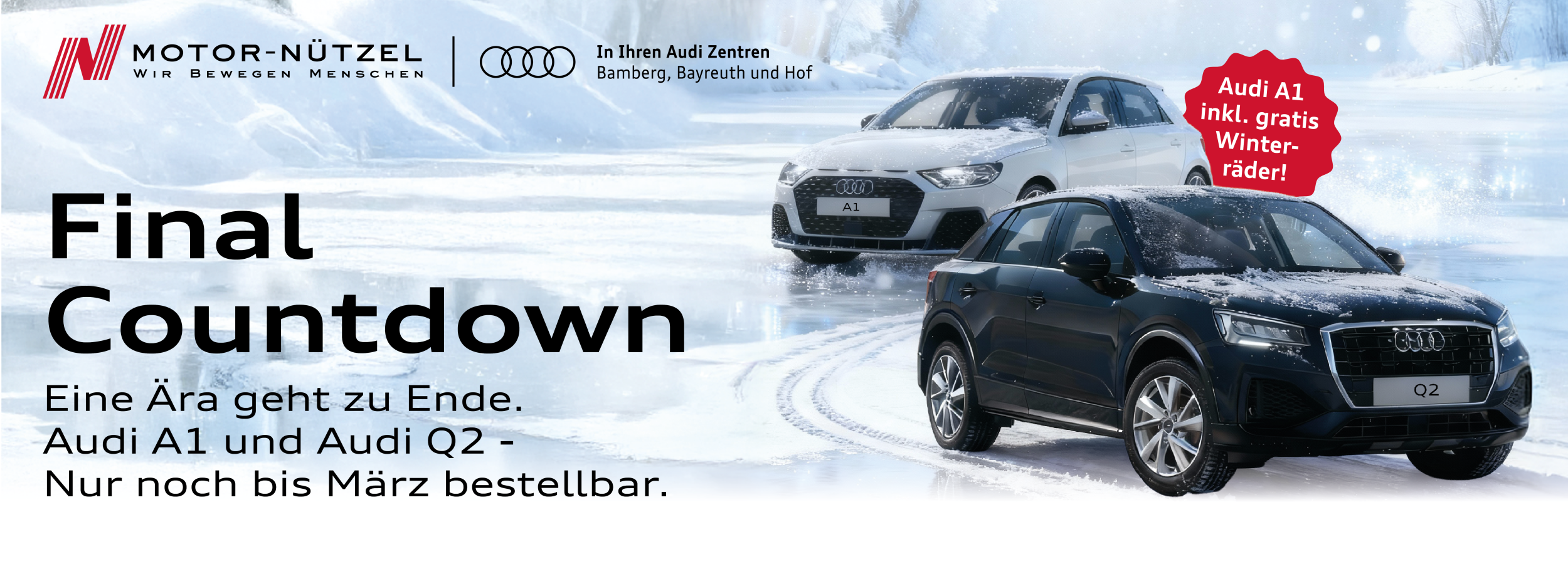 Der Audi A1 Sportback läuft im Februar das letzte Mal vom Band. Damit geht eine Ära kompakter Fahrfreude zu Ende. Sichern Sie sich jetzt eines der letzten Modelle – einmalig und nur für kurze Zeit bei Motor-Nützel: Erhalten Sie einen Satz Winterräder kostenlos dazu!