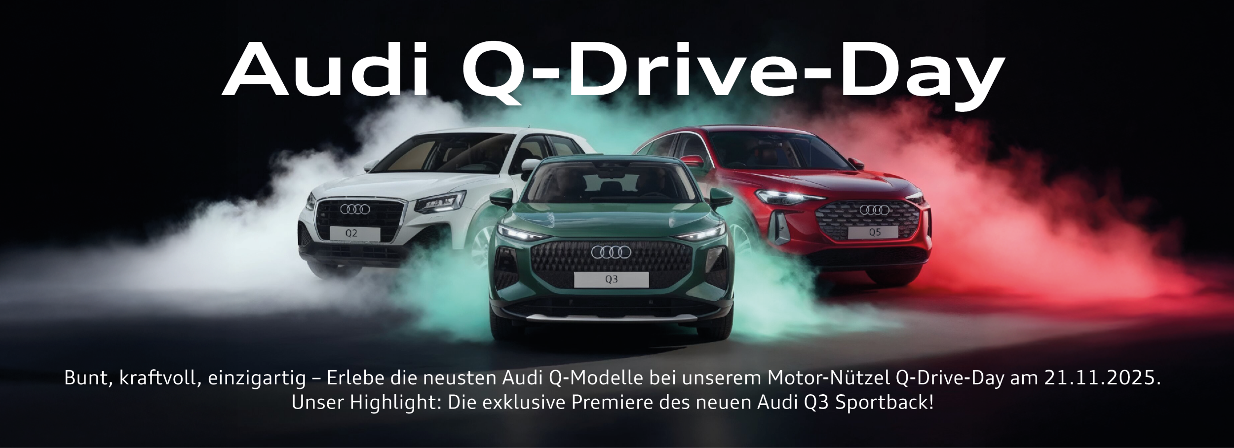 Freuen Sie sich auf exklusive Probefahrten aus der Audi Q-Reihe und erleben Sie die Vielfalt hautnah. Vom bewährten Q2 über den neu gestalteten Q3 bis hin zum kraftvollen Q5 und viele weitere Variationen – entdecken Sie die unterschiedlichen Charaktere und Stärken unserer Flotte und erhalten Sie viele Einblicke in die Welt der E-Mobilität. Bei Vergleichsfahrten können Sie verschiedene Modelle direkt gegeneinander testen und herausfinden, welches am besten zu Ihnen passt. Für Ihr leibliches Wohl ist natürlich gesorgt.